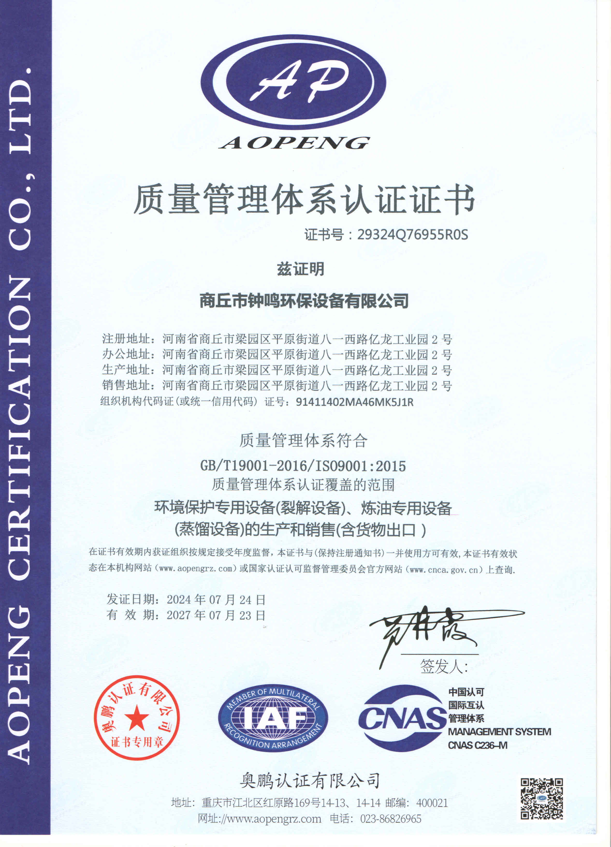 環(huán)境管理體系認(rèn)證證書
